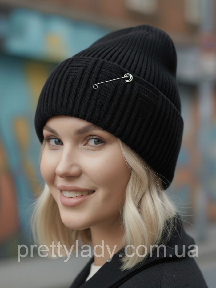 Шапка унісекс рванка з англійською декоративною булавкою та відворотом чорна