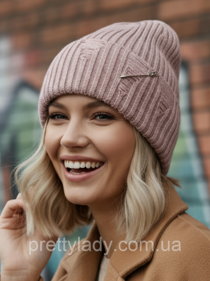 Шапка унісекс рванка з англійською декоративною булавкою та відворотом пудра