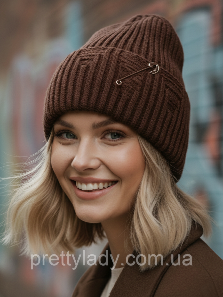 Шапка унісекс рванка з англійською декоративною булавкою та відворотом коричнева (шоколад)