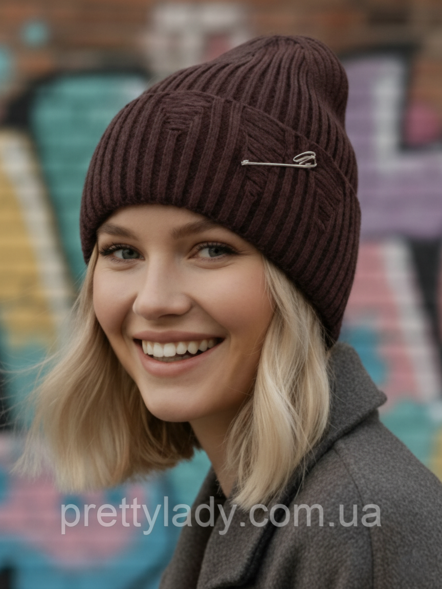 Шапка унісекс рванка з англійською декоративною булавкою та відворотом темно-коричнева